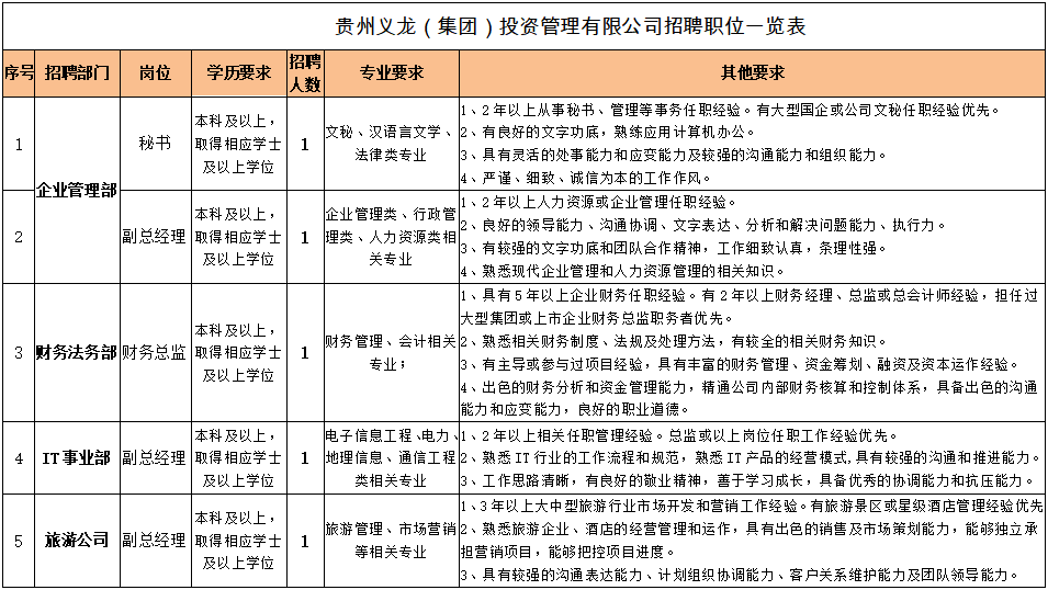 1、貴州義龍(集團(tuán))投資管理有限公司招聘職位一覽表