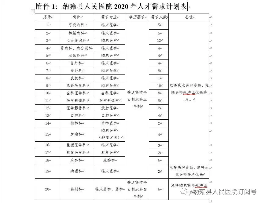 普通高校全日制本科及以上學歷畢業(yè)生100人。具體崗位詳見《納雍縣人民醫(yī)院2020年人才需求計劃表》。